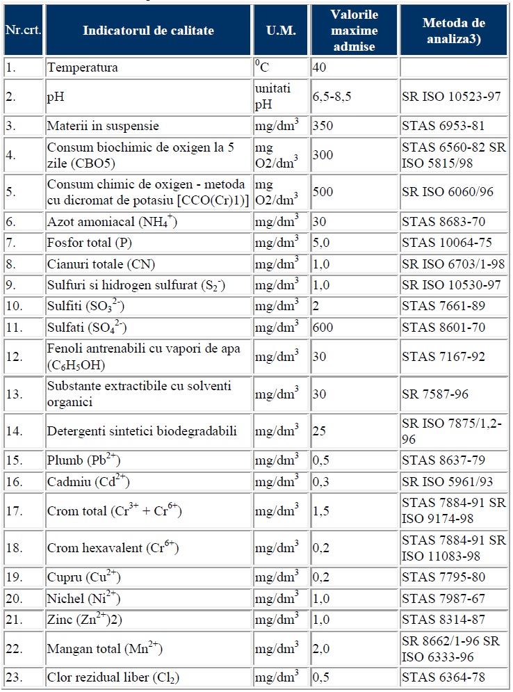 Enumerarea din tabel nu este limitativa; operatorul de servicii publice care exploateaza si administreaza reteaua de canalizare si statia de epurare, impreuna cu proiectantul care detine raspunderea realizarii parametrilor proiectati si, dupa caz, prin implicarea unitatii de cercetare tehnologica, care a fundamentat solutia de proiectare pentru reteaua de canalizare si/sau pentru statia de epurare, pot stabili, in functie de profilul activitatii desfasurate de abonat, limite si pentru alti indicatori, tinand seama de prescriptiile generale de evacuare si, atunci cand este cazul, si de efectul cumulat al unor agenti corosivi si/sau toxici asupra retelei de canalizare si instalatiilor de epurare.